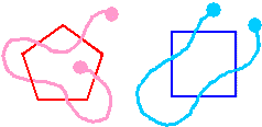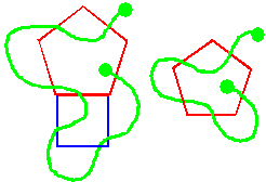 | Thus, all even-sided polygons are ?start outside, finish outside? and actually form a loop. On the other hand, all odd-sided polygons behave: ?start outside, finish inside.? You cannot form a loop. In fact, for our purposes, heptagon = pentagon = triangle Interestingly, if you put two of these shapes next to each other, you will notice that a pentagon attached next to a square (or rectangle) behaves as if the square is absent. Note how similar the two green lines are. |