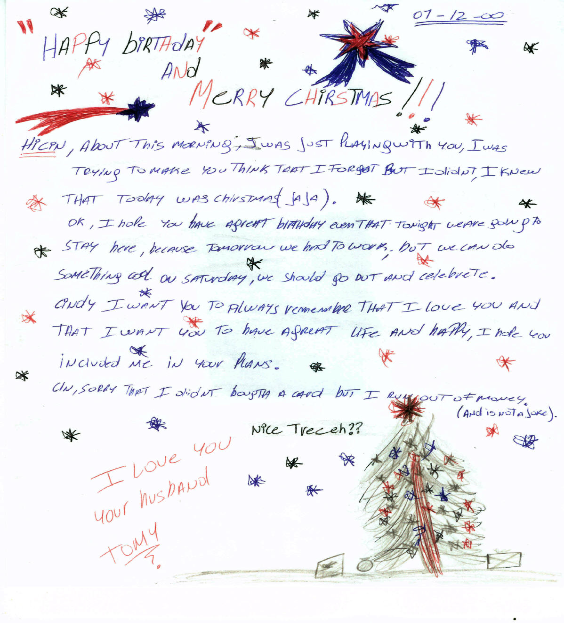 The above homemade birthday card was written by Cindy's husband Tomas on her 28th birthday