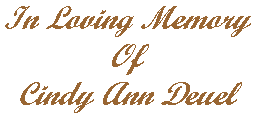 | Cindy Bio & Timeline Photo Album Posts From Friends Posts From Family Words From Husband Words From The Heart Private Forum In her own words Memorial Service Cindy's Headstone In The News Sermon Logic Problems Keith Deuel's Photo Album |