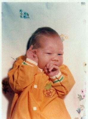 same baby in a red baby shirt.